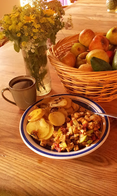 And finally, a vegan breakfast I made myself this morning, including tempeh, tomatoes, zucchini, potatoes and a bunch of other small ingredients. If I were better at painting, I would turn this into a still life project.